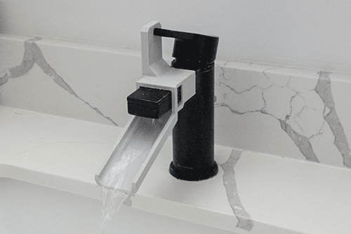 Dumbest thing I've had to design and print. Previous owners had a contractor install new faucets (among other defects) that pour water 1cm away from the edge of the countertop. This extends the water a reasonable distance.